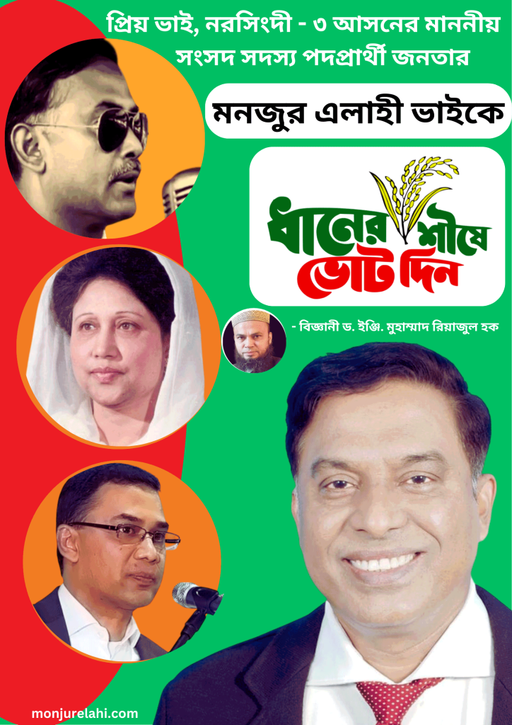 প্রিয় শিবপুর বাসী, আসসালামু আলাইকুম, দক্ষিণ এশিয়ার সবচেয়ে জনপ্রিয় রাষ্ট্রপতি, সার্কের প্রতিষ্ঠাতা, স্বনির্ভর বাংলাদেশের রূপকার, রণাঙ্গনের বীর মুক্তিযোদ্ধা শহীদ প্রেসিডেন্ট জিয়াউর রহমান ও বাংলাদেশের ইতিহাসে সবচেয়ে জনপ্ৰিয় প্রধানমন্ত্রী, আপোষহীন নেত্রী, গণতন্ত্রের মা, বেগম খালেদা জিয়ার কলিজার টুকরা সন্তান, প্রচন্ড মেধাবী, দূরদর্শী ও বিচক্ষণ নেতা জনাব তারেক রহমান সাহেবের হাতেই বাংলাদেশ ও সকল ধর্মের মানুষ নিরাপদ, তাই বিএনপিকে ধানের শীষে ভোট দিন । এবং আমার প্রিয় ভাই নরসিংদী -৩ আসনের মাননীয় সংসদ সদস্য পদপ্রার্থী, তরুণ ভোটারদের আশার আলো, শিবপুরের গৌরব, বিশিষ্ট সমাজসেবক, শিল্পপতি, শিক্ষানুরাগী, গরীবের বন্ধু, প্রাণপ্রিয় নেতা জনতার মনজুর এলাহী ভাইকে ধানের শীষে ভোট দিন । আগামী ১২ই ফেব্রুয়ারি ২০২৬ইং উৎসবমুখর পরিবেশে ভোট দেওয়ার জন্য আপনারা সকলেই বিশেষভাবে আমন্ত্রিত। - ড্রোন বিজ্ঞানী ড. ইঞ্জি.মুহাম্মাদ রিয়াজুল হক ।